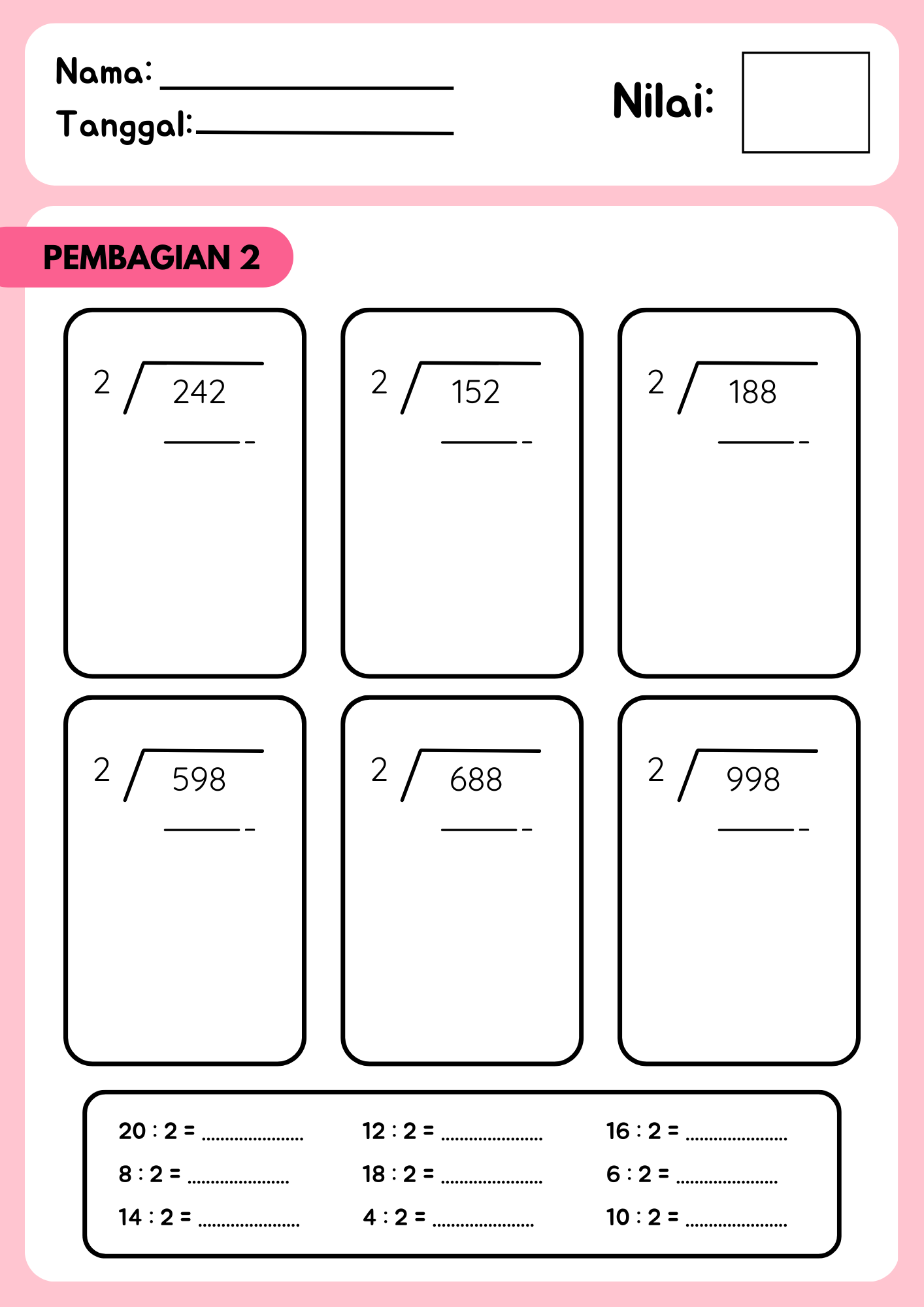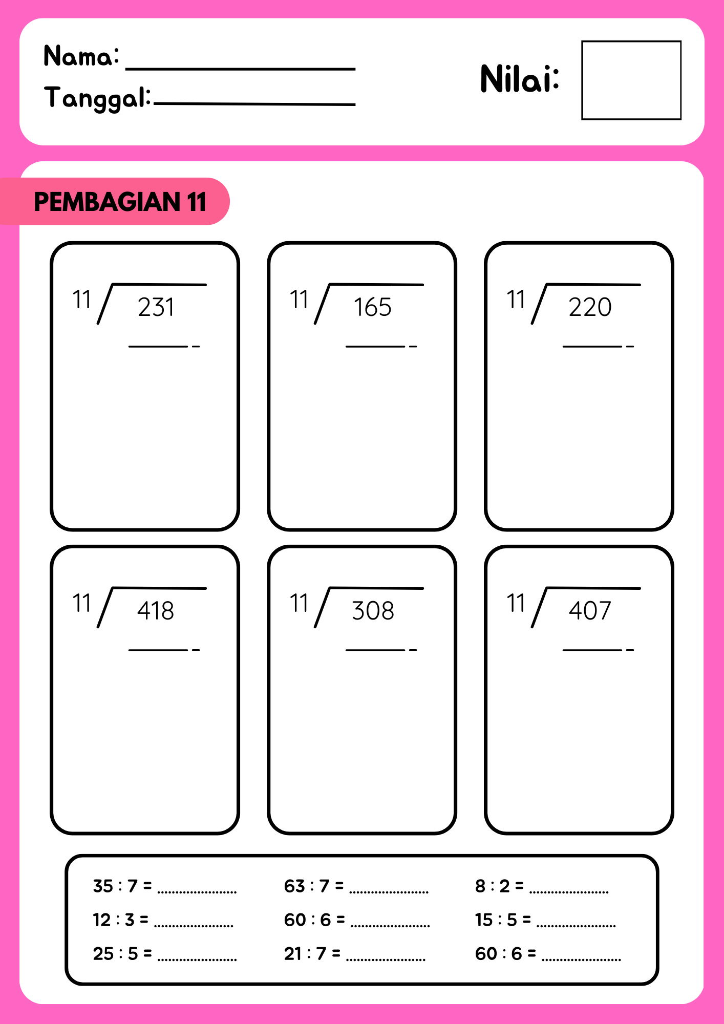 - Pembagian bilangan tiga digit dengan dua digit (untuk versi yang lebih menantang).